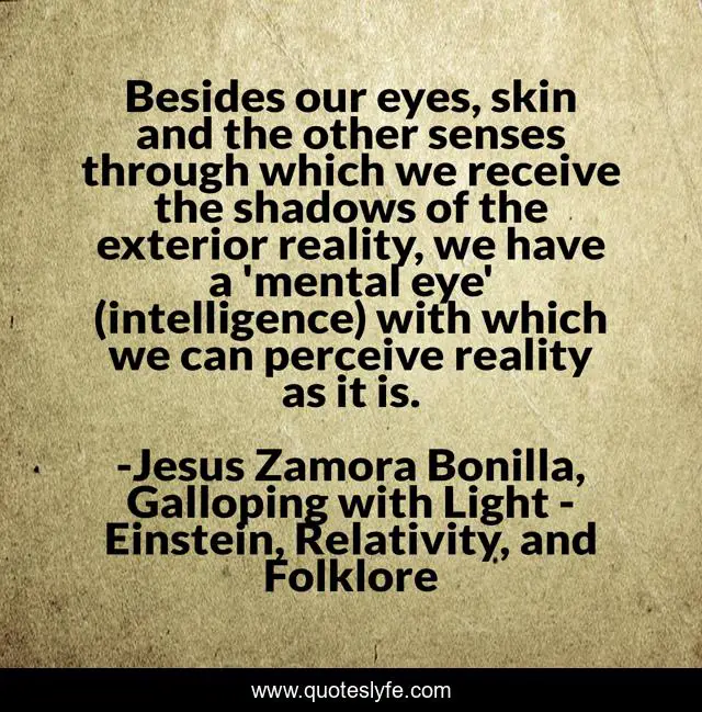 This page presents the quote "Besides our eyes, skin and the other senses through which we receive the shadows of the exterior reality, we have a 'mental eye' (intelligence) with which we can perceive reality as it is.". Author of this quote is Jesus Zamora Bonilla, Galloping with Light - Einstein, Relativity, and Folklore. This quote is about epistemology, philosophy, science,.