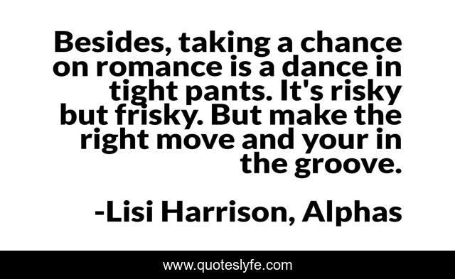 This page presents the quote "Besides, taking a chance on romance is a dance in tight pants. It's risky but frisky. But make the right move and your in the groove.". Author of this quote is Lisi Harrison, Alphas. This quote is about allie-j, lyrics,.