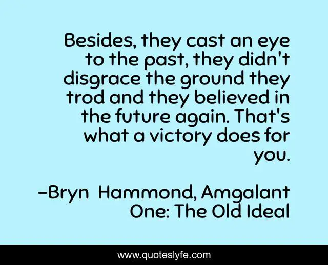This page presents the quote "Besides, they cast an eye to the past, they didn't disgrace the ground they trod and they believed in the future again. That's what a victory does for you.". Author of this quote is Bryn Hammond, Amgalant One: The Old Ideal. .