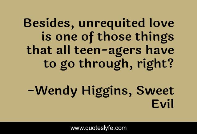 This page presents the quote "Besides, unrequited love is one of those things that all teen-agers have to go through, right?". Author of this quote is Wendy Higgins, Sweet Evil. This quote is about anna-whitt, unrequited-love,.