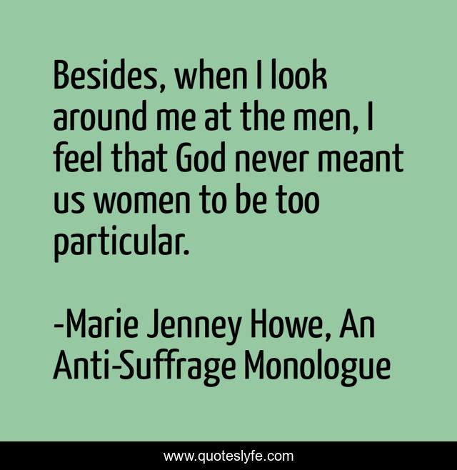 This page presents the quote "Besides, when I look around me at the men, I feel that God never meant us women to be too particular.". Author of this quote is Marie Jenney Howe, An Anti-Suffrage Monologue. This quote is about humor, feminism, women,.