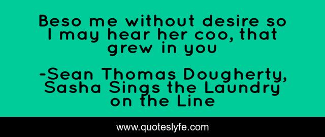 This page presents the quote "Beso me without desire so I may hear her coo, that grew in you". Author of this quote is Sean Thomas Dougherty, Sasha Sings the Laundry on the Line. This quote is about desire, love, beso, on-comes-light-one, kiss, pregnancy, daughter, sean-thomas-dougherty, affection,.