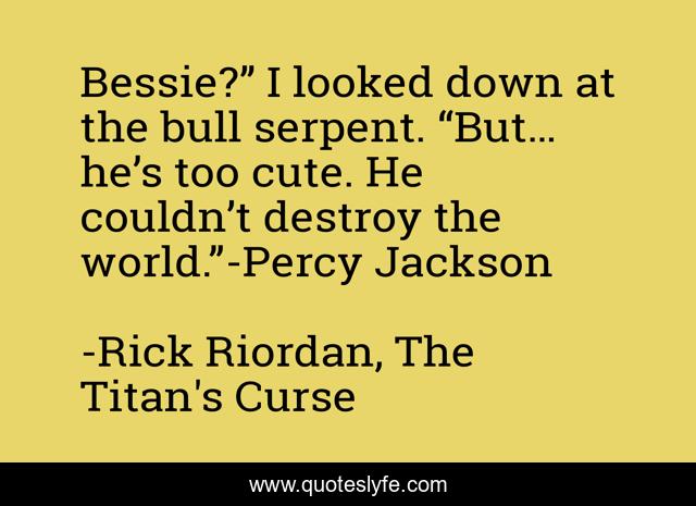 This page presents the quote "Bessie?” I looked down at the bull serpent. “But… he’s too cute. He couldn’t destroy the world.”-Percy Jackson". Author of this quote is Rick Riordan, The Titan's Curse. .