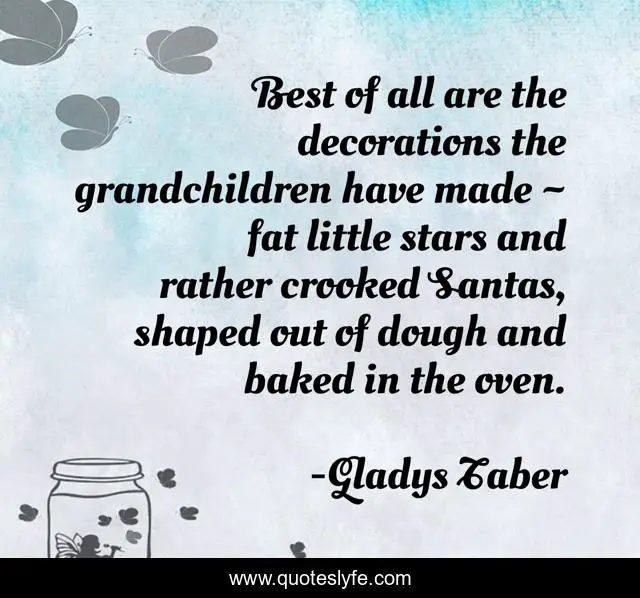 This page presents the quote "Best of all are the decorations the grandchildren have made ~ fat little stars and rather crooked Santas, shaped out of dough and baked in the oven.". Author of this quote is Gladys Taber. .