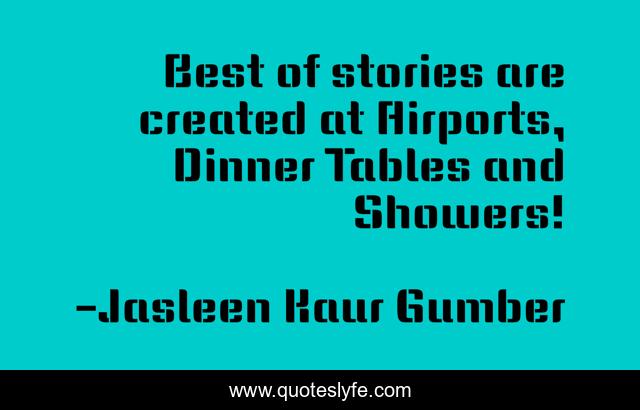 This page presents the quote "Best of stories are created at Airports, Dinner Tables and Showers!". Author of this quote is Jasleen Kaur Gumber. This quote is about life, love, philosophy, airport, wisdom, quotes, dinner, stories, best,.