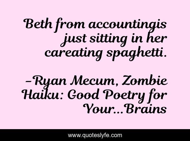 This page presents the quote "Beth from accountingis just sitting in her careating spaghetti.". Author of this quote is Ryan Mecum, Zombie Haiku: Good Poetry for Your...Brains. This quote is about humor, zombies, haiku,.