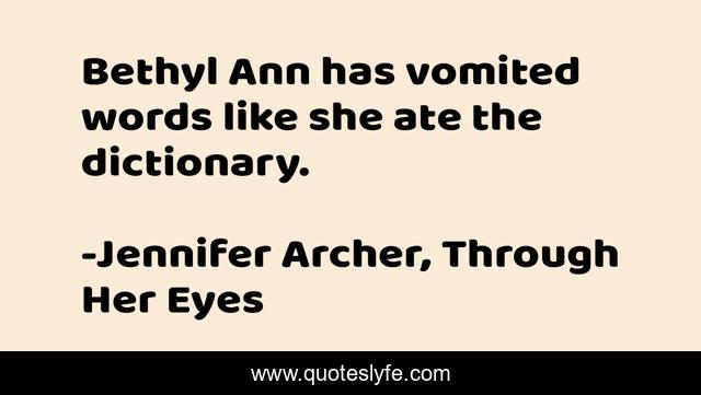 This page presents the quote "Bethyl Ann has vomited words like she ate the dictionary.". Author of this quote is Jennifer Archer, Through Her Eyes. .