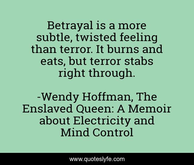 This page presents the quote "Betrayal is a more subtle, twisted feeling than terror. It burns and eats, but terror stabs right through.". Author of this quote is Wendy Hoffman, The Enslaved Queen: A Memoir about Electricity and Mind Control. This quote is about emotion, traumatic-bonding, betrayal, emotions, feelings, trauma, terror, emotions-people-control, traumatic-experiences,.