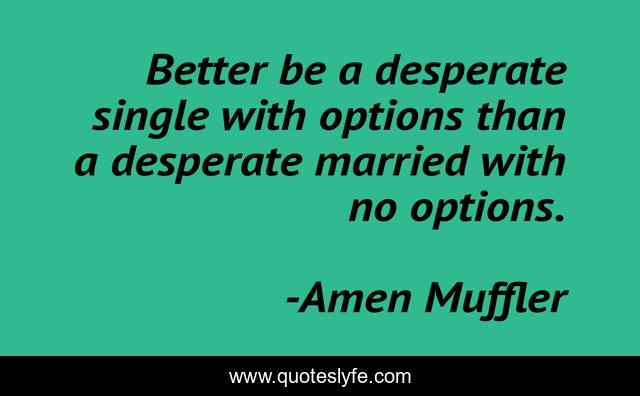This page presents the quote "Better be a desperate single with options than a desperate married with no options.". Author of this quote is Amen Muffler. This quote is about single-life, life, reality-of-life, reality-sucks, marriage, life-lessons, couple-advice,.