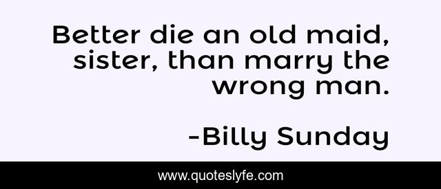 This page presents the quote "Better die an old maid, sister, than marry the wrong man.". Author of this quote is Billy Sunday. This quote is about spinsterhood, marriage, old-maid,.