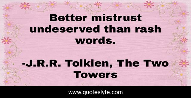 This page presents the quote "Better mistrust undeserved than rash words.". Author of this quote is J.R.R. Tolkien, The Two Towers. This quote is about rash-words, trust,.