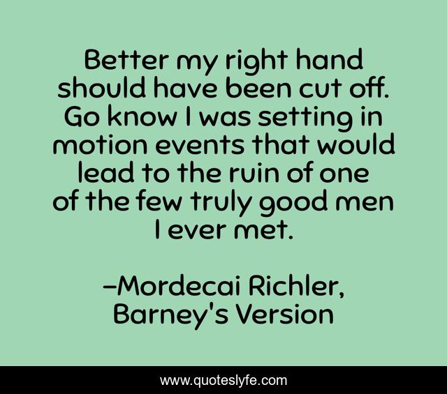 This page presents the quote "Better my right hand should have been cut off. Go know I was setting in motion events that would lead to the ruin of one of the few truly good men I ever met.". Author of this quote is Mordecai Richler, Barney's Version. This quote is about loss, death, regret, accident, doomed, depressing, curse, avoidable, preventable,.