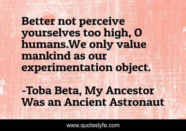 This page presents the quote "Better not perceive yourselves too high, O humans.We only value mankind as our experimentation object.". Author of this quote is Toba Beta, My Ancestor Was an Ancient Astronaut. This quote is about overconfidence, arrogance,.