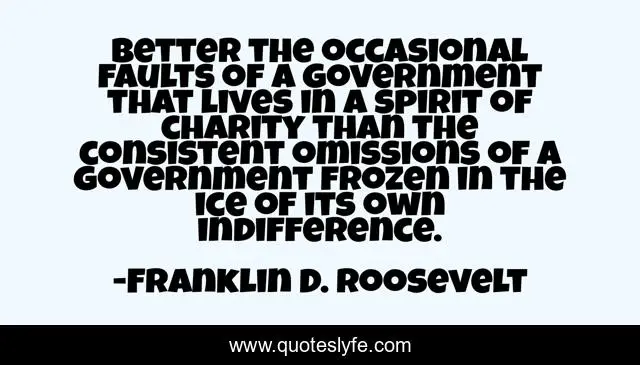 This page presents the quote "Better the occasional faults of a government that lives in a spirit of charity than the consistent omissions of a government frozen in the ice of its own indifference.". Author of this quote is Franklin D. Roosevelt. This quote is about politics, charity, government,.