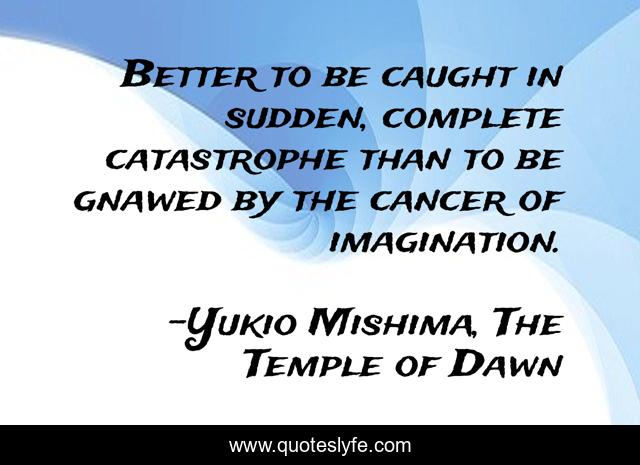 This page presents the quote "Better to be caught in sudden, complete catastrophe than to be gnawed by the cancer of imagination.". Author of this quote is Yukio Mishima, The Temple of Dawn. This quote is about imagination, life, dullness, destruction,.