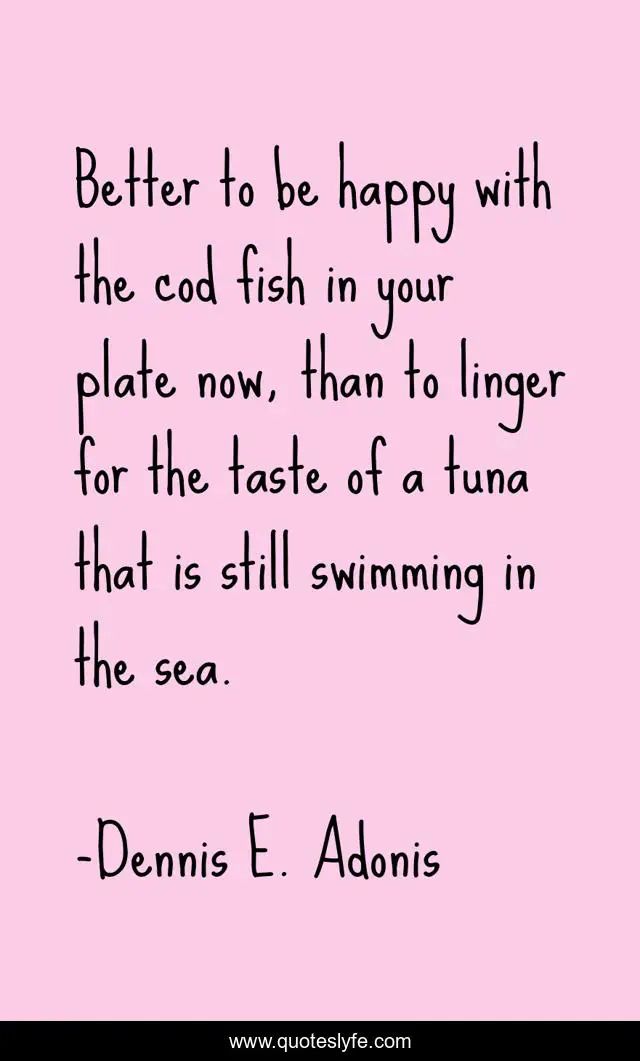 This page presents the quote "Better to be happy with the cod fish in your plate now, than to linger for the taste of a tuna that is still swimming in the sea.". Author of this quote is Dennis E. Adonis. This quote is about satisfy, love, relationship, money, together, choices, contentment, greed, marriage,.