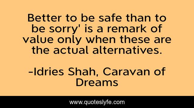This page presents the quote "Better to be safe than to be sorry' is a remark of value only when these are the actual alternatives.". Author of this quote is Idries Shah, Caravan of Dreams. This quote is about sufism, flexibility, sufis, mind, conditioning,.