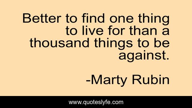 This page presents the quote "Better to find one thing to live for than a thousand things to be against.". Author of this quote is Marty Rubin. This quote is about anger, affirmation, negation, happiness, nihilism,.