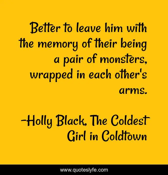 This page presents the quote "Better to leave him with the memory of their being a pair of monsters, wrapped in each other's arms.". Author of this quote is Holly Black, The Coldest Girl in Coldtown. This quote is about love, monster, vampire, memory, cold, affection,.