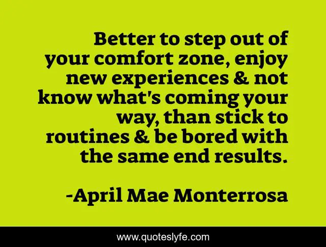This page presents the quote "Better to step out of your comfort zone, enjoy new experiences & not know what's coming your way, than stick to routines & be bored with the same end results.". Author of this quote is April Mae Monterrosa. This quote is about comfort-zone, new-experiences, growth, stepping-into-a-new-territory, the-unexpected,.