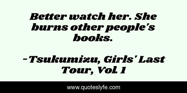 This page presents the quote "Better watch her. She burns other people's books.". Author of this quote is Tsukumizu, Girls' Last Tour, Vol. 1. This quote is about book-burning, tsukumizu, sarcasm, girls-last-tour, books, chito, manga,.
