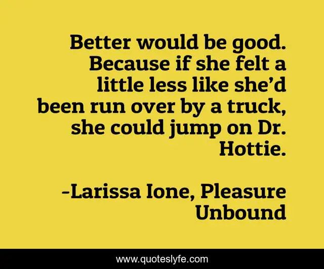 This page presents the quote "Better would be good. Because if she felt a little less like she’d been run over by a truck, she could jump on Dr. Hottie.". Author of this quote is Larissa Ione, Pleasure Unbound. .
