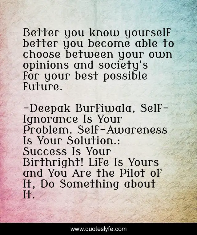 This page presents the quote "Better you know yourself better you become able to choose between your own opinions and society's for your best possible future.". Author of this quote is Deepak Burfiwala, Self-Ignorance Is Your Problem. Self-Awareness Is Your Solution.: Success Is Your Birthright! Life Is Yours and You Are the Pilot of It, Do Something about It.. This quote is about self-awareness, success,.