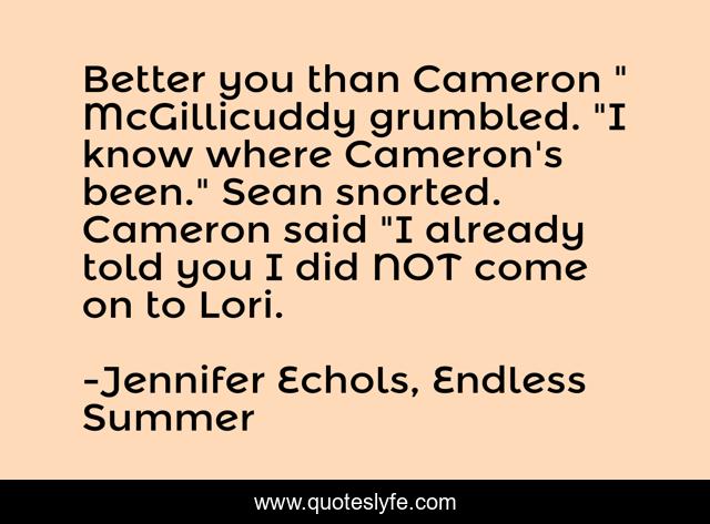 This page presents the quote "Better you than Cameron " McGillicuddy grumbled. "I know where Cameron's been." Sean snorted. Cameron said "I already told you I did NOT come on to Lori.". Author of this quote is Jennifer Echols, Endless Summer. This quote is about summer, romantic, endless-summer, jennifer, echols, jennifer-echols, boys-next-door, adam, the-boys-next-door,.