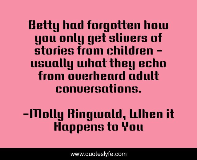 This page presents the quote "Betty had forgotten how you only get slivers of stories from children - usually what they echo from overheard adult conversations.". Author of this quote is Molly Ringwald, When it Happens to You. This quote is about stories, children,.