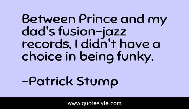 This page presents the quote "Between Prince and my dad's fusion-jazz records, I didn't have a choice in being funky.". Author of this quote is Patrick Stump. This quote is about records, funky, choice,.