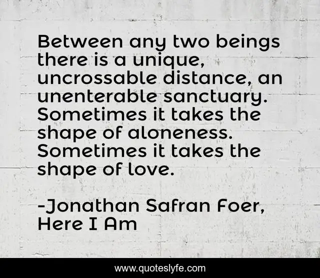 This page presents the quote "Between any two beings there is a unique, uncrossable distance, an unenterable sanctuary. Sometimes it takes the shape of aloneness. Sometimes it takes the shape of love.". Author of this quote is Jonathan Safran Foer, Here I Am. This quote is about relationships, aloneness, love, affection,.
