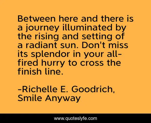 This page presents the quote "Between here and there is a journey illuminated by the rising and setting of a radiant sun. Don't miss its splendor in your all-fired hurry to cross the finish line.". Author of this quote is Richelle E. Goodrich, Smile Anyway. This quote is about life, richelle, journey, determination, goals, richelle-goodrich, dreams,.