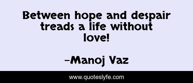 This page presents the quote "Between hope and despair treads a life without love!". Author of this quote is Manoj Vaz. This quote is about despire, life, love, living, hope, affection,.