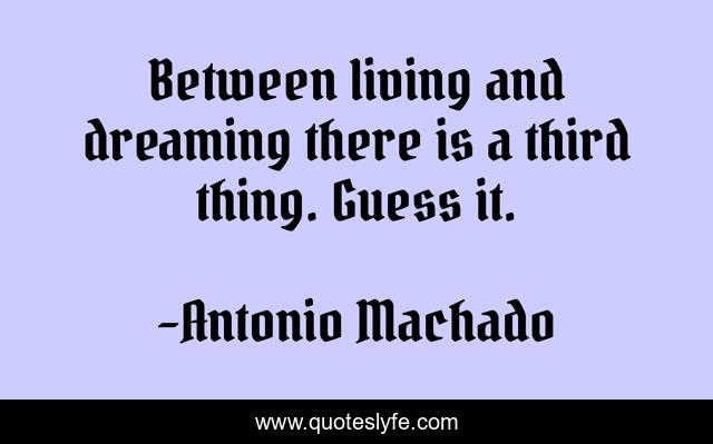This page presents the quote "Between living and dreaming there is a third thing. Guess it.". Author of this quote is Antonio Machado. This quote is about guessing, food-for-thought, living, philosophy, life, dreaming, dream, dreams,.