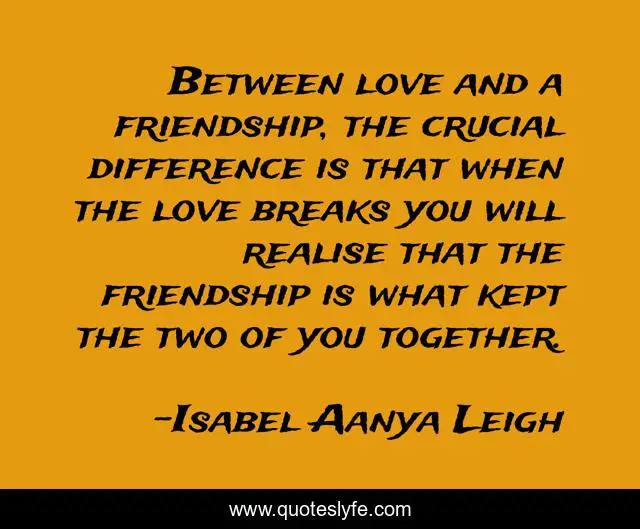 This page presents the quote "Between love and a friendship, the crucial difference is that when the love breaks you will realise that the friendship is what kept the two of you together.". Author of this quote is Isabel Aanya Leigh. This quote is about broken-heart, friendship, love, affection,.