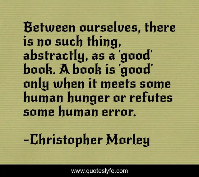 This page presents the quote "Between ourselves, there is no such thing, abstractly, as a 'good' book. A book is 'good' only when it meets some human hunger or refutes some human error.". Author of this quote is Christopher Morley. .