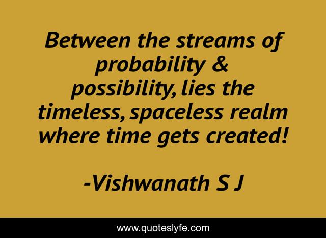 This page presents the quote "Between the streams of probability & possibility, lies the timeless, spaceless realm where time gets created!". Author of this quote is Vishwanath S J. This quote is about life, philosophy, probability, quote, time-travel, timeless, possibility, wisdom, logical,.