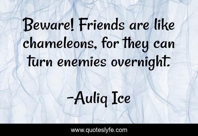 This page presents the quote "Beware! Friends are like chameleons, for they can turn enemies overnight.". Author of this quote is Auliq Ice. This quote is about enemity, enemies-and-opposition, betrayal, fighting, trials-of-life, victory, hatred, hate, enemies,.