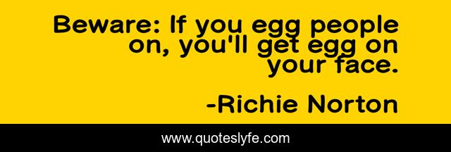 This page presents the quote "Beware: If you egg people on, you'll get egg on your face.". Author of this quote is Richie Norton. This quote is about confidence, self-mastery, mindful, marketing, work, success, self-help, entrepreneur, innovation,.