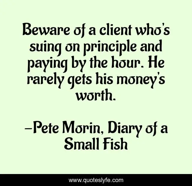 This page presents the quote "Beware of a client who's suing on principle and paying by the hour. He rarely gets his money's worth.". Author of this quote is Pete Morin, Diary of a Small Fish. This quote is about justice, small-fish, lawyers,.