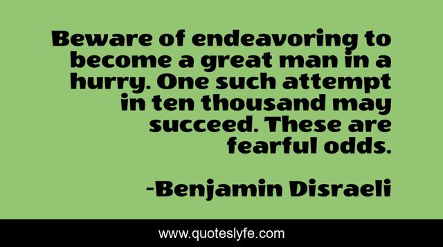 This page presents the quote "Beware of endeavoring to become a great man in a hurry. One such attempt in ten thousand may succeed. These are fearful odds.". Author of this quote is Benjamin Disraeli. This quote is about great, great man, man,.