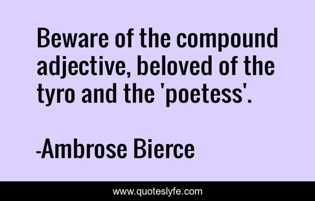 This page presents the quote "Beware of the compound adjective, beloved of the tyro and the 'poetess'.". Author of this quote is Ambrose Bierce. This quote is about language, writing,.