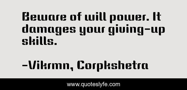 This page presents the quote "Beware of will power. It damages your giving-up skills.". Author of this quote is Vikrmn, Corpkshetra. This quote is about gwg, vikram, will-power, positive, motivational, confidence, ca-vikram-verma, guru-with-guitar, vikrmn,.