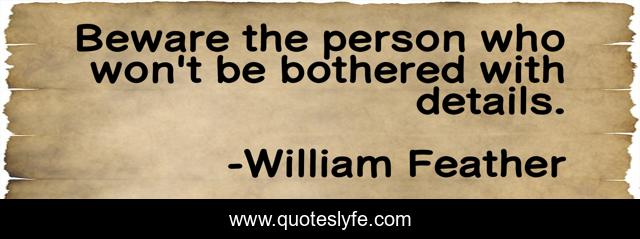 This page presents the quote "Beware the person who won't be bothered with details.". Author of this quote is William Feather. This quote is about quote, william-feather, details, quotes,.
