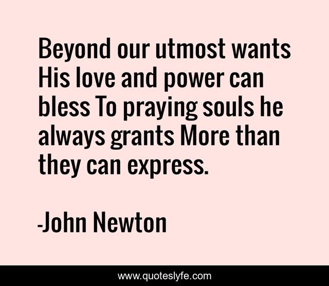 This page presents the quote "Beyond our utmost wants His love and power can bless To praying souls he always grants More than they can express.". Author of this quote is John Newton. .