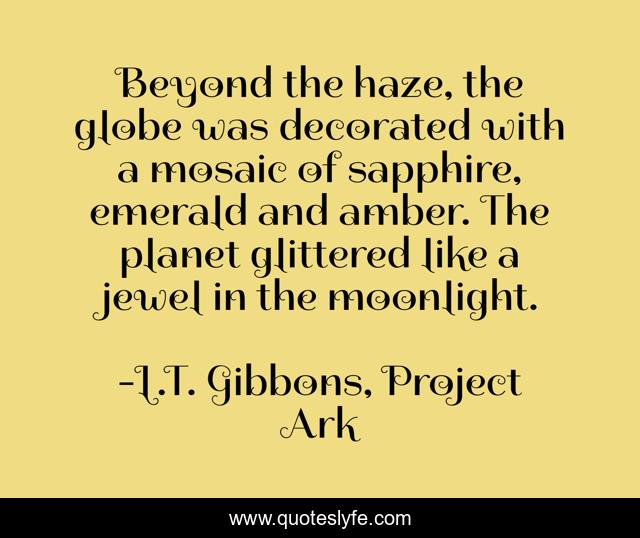 This page presents the quote "Beyond the haze, the globe was decorated with a mosaic of sapphire, emerald and amber. The planet glittered like a jewel in the moonlight.". Author of this quote is L.T. Gibbons, Project Ark. This quote is about descriptive, sci-fi, space,.
