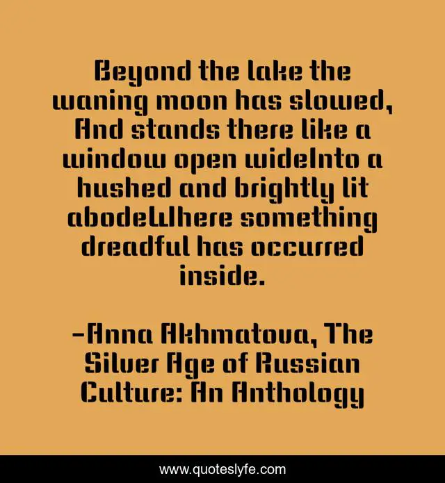 This page presents the quote "Beyond the lake the waning moon has slowed, And stands there like a window open wideInto a hushed and brightly lit abodeWhere something dreadful has occurred inside.". Author of this quote is Anna Akhmatova, The Silver Age of Russian Culture: An Anthology. .