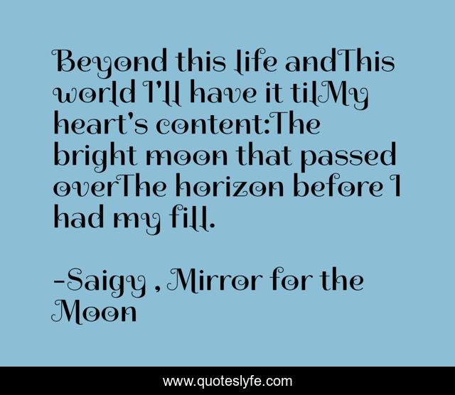 This page presents the quote "Beyond this life andThis world I'll have it tilMy heart's content:The bright moon that passed overThe horizon before I had my fill.". Author of this quote is Saigyō, Mirror for the Moon. .