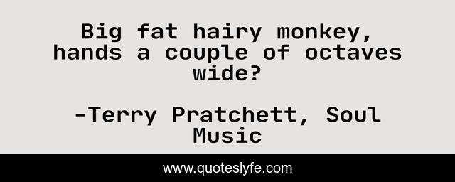 This page presents the quote "Big fat hairy monkey, hands a couple of octaves wide?". Author of this quote is Terry Pratchett, Soul Music. This quote is about librarian, music, monkey,.