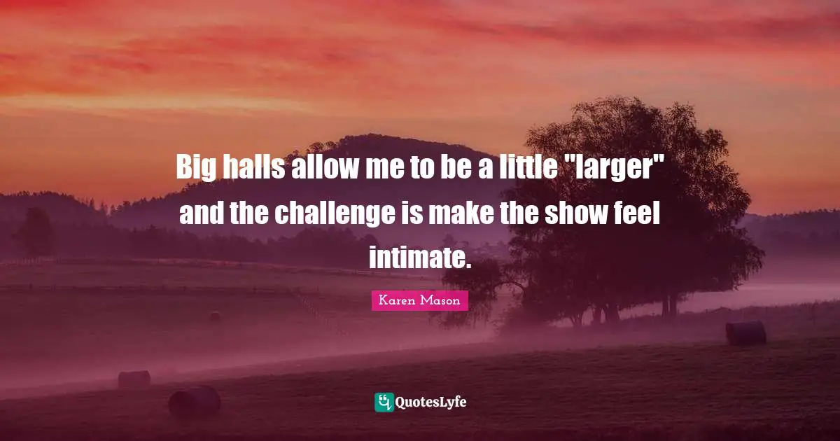 This page presents the quote "Big halls allow me to be a little "larger" and the challenge is make the show feel intimate.". Author of this quote is Karen Mason. This quote is about challenges, intimate, littles, halls,.